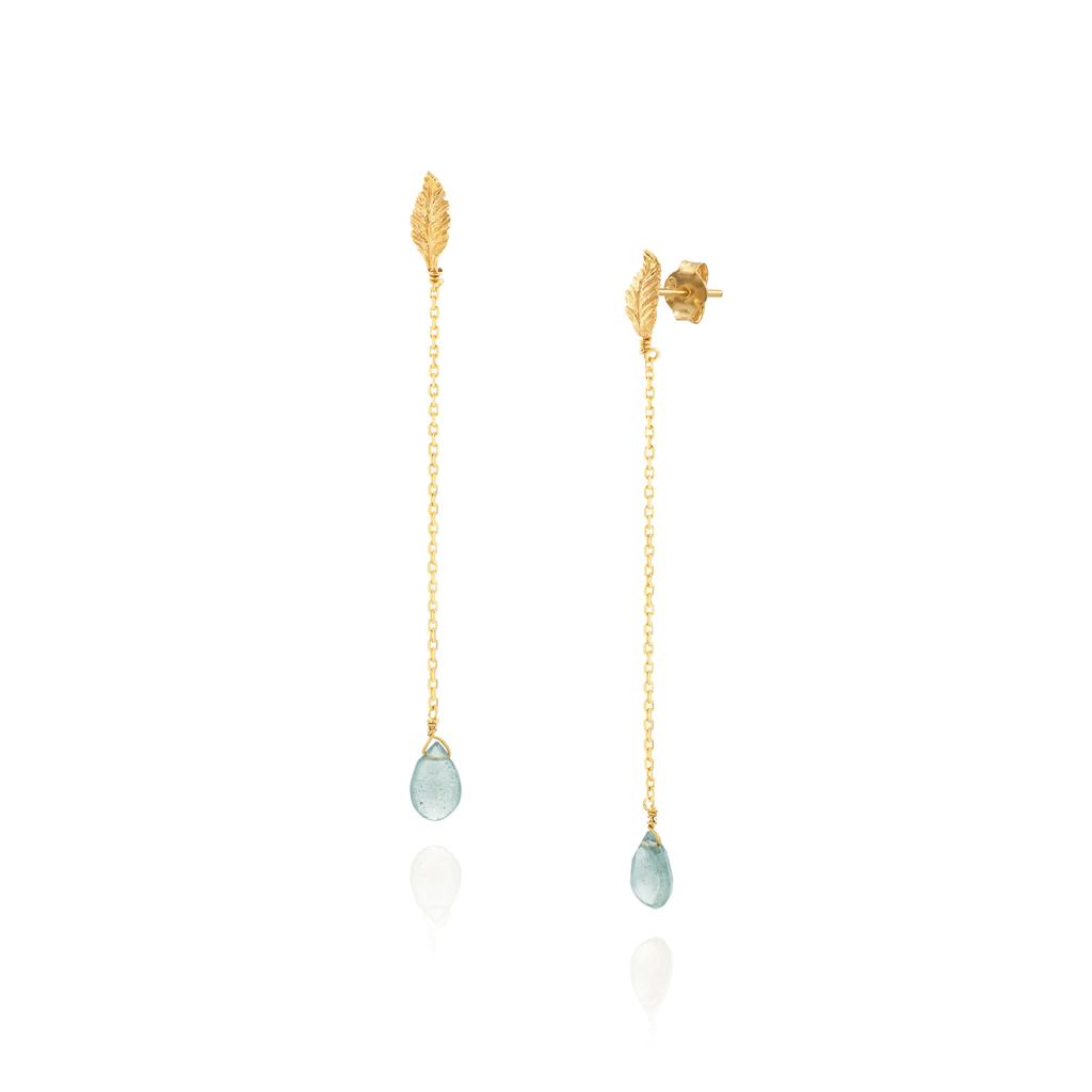 Brincos compridos com malha, folhas e pedras naturais. A tonalidade e dimensão das pedras podem variar devido à sua natureza.