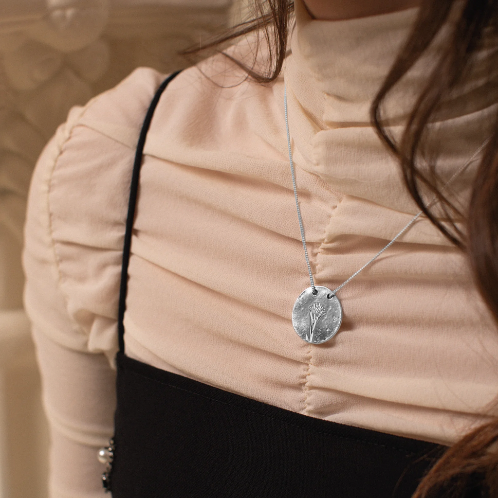Necklace with pendant. Medal with floral motif and embossed letter.