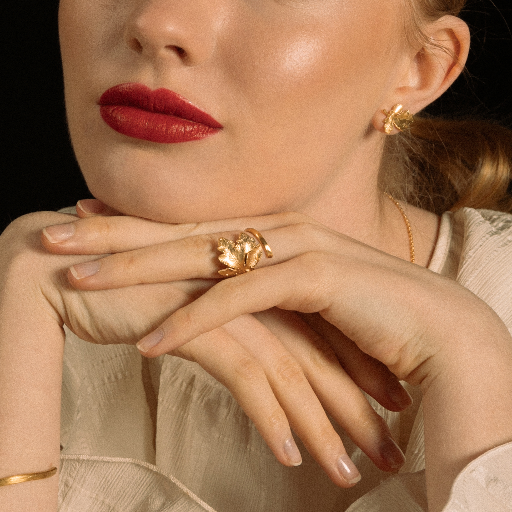 Anel aberto com motivos de folhas de videira. Ligeiramente ajustável.