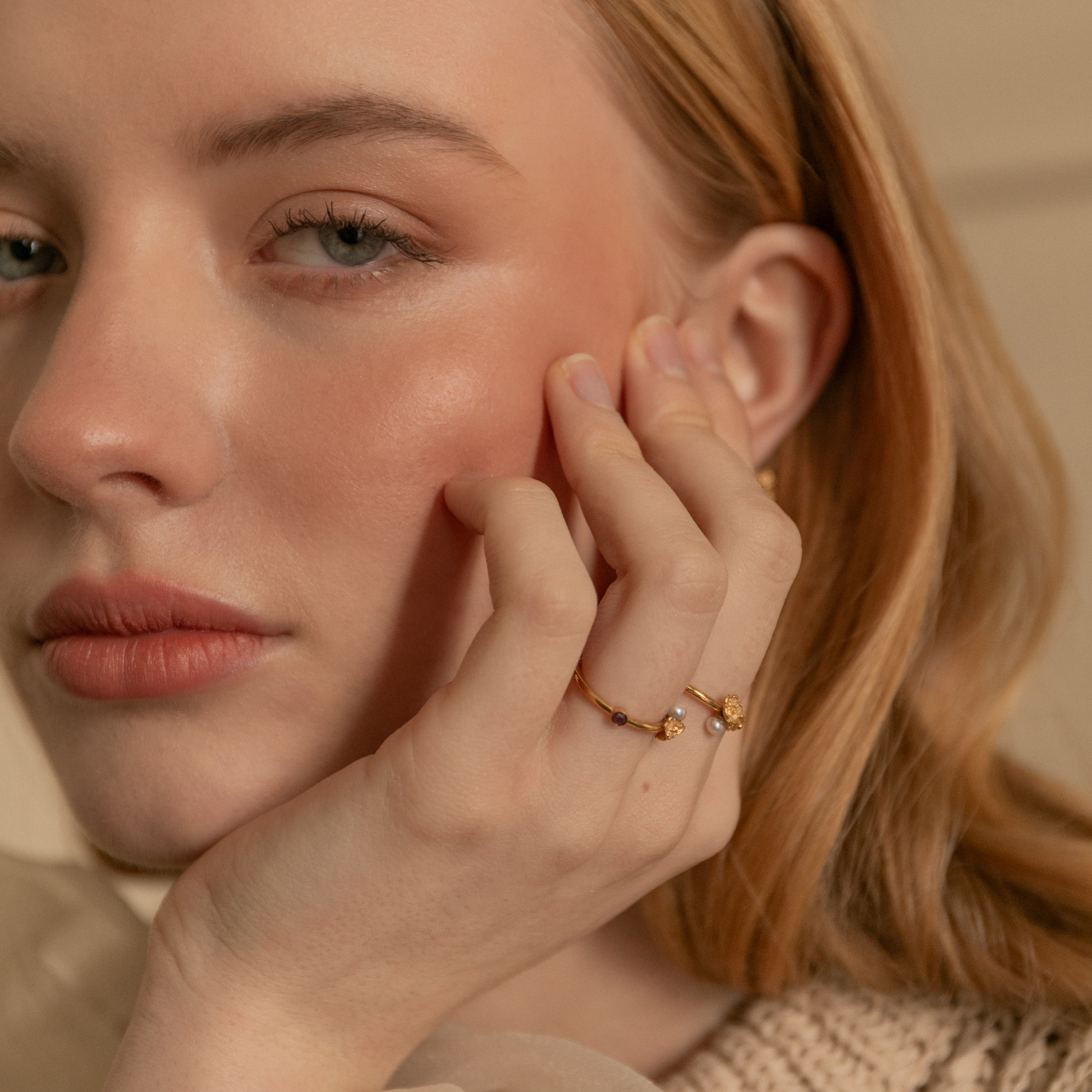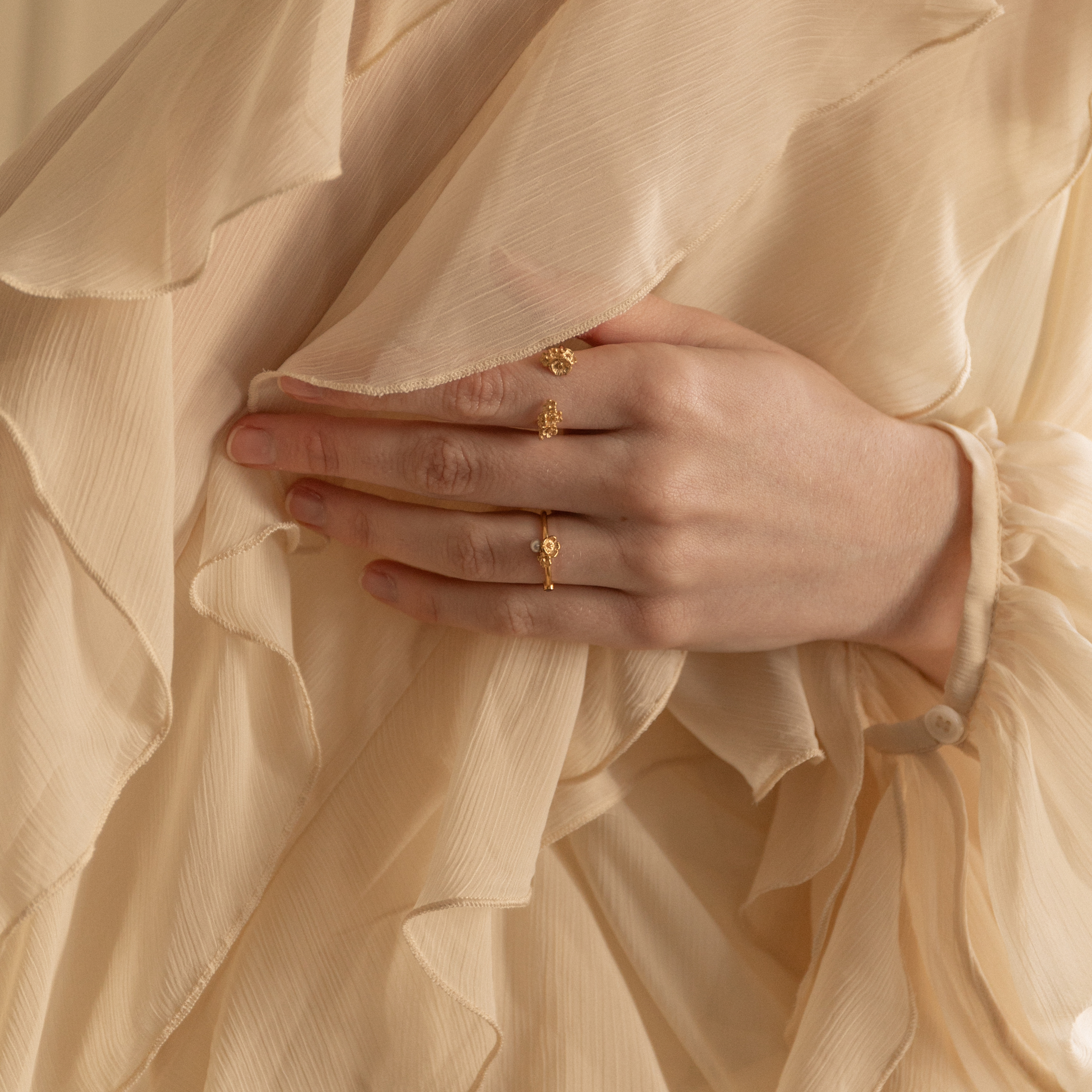 Anel fino com miosótis e pérola. Delicado e confortável, indicada para uso diário e momentos especiais.
